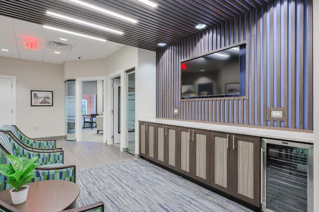 The interior transformation includes a new transaction teller line, three waiting areas, and two offices. The focal point is the spacious, open lobby adorned with earthy tones, creating a welcoming ambiance. Beyond the interior, the exterior received a revitalization, featuring a fresh coat of paint, replacement of wall signs with painted wall panels matching storefront windows, and the replacement of the main building and drive-up canopy. The drive-up island was expanded to accommodate an ATM, and all first and second floor exterior glass was renewed, breathing new life into the structure.