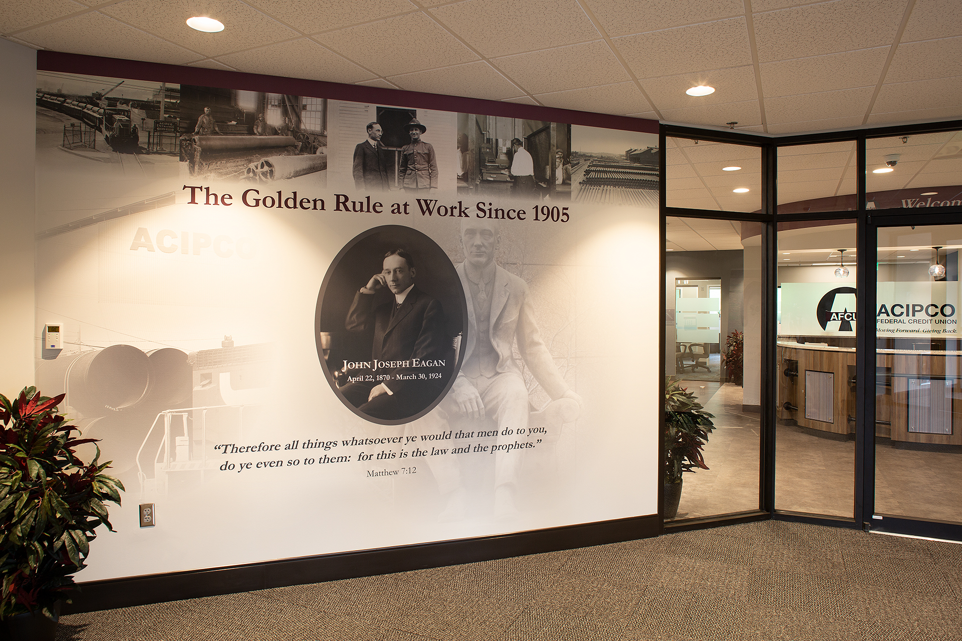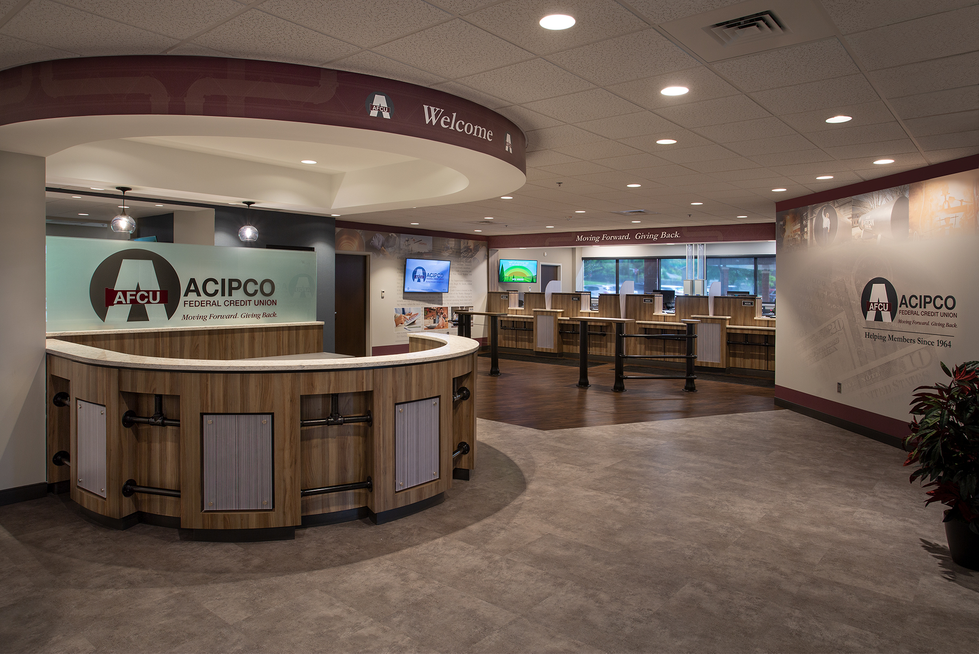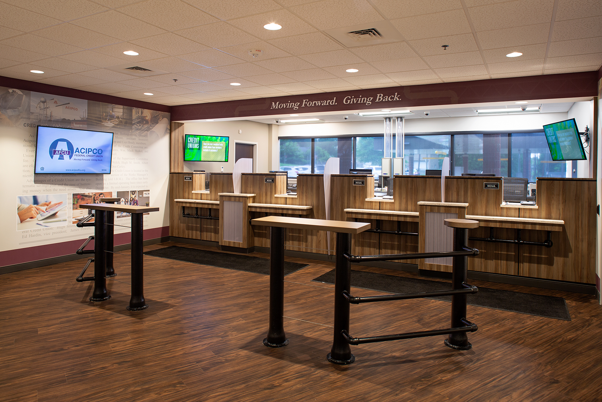 The credit union’s new main office provides an entirely new banking experience to members, including all new drive-thru banking services with full-service tellers and an ATM, and a new retail lobby designed to provide members with all the latest banking products and services in an environment that highlights ACIPCO’s rich history and employee-first business philosophy, which is illustrated graphically on custom wallcoverings throughout the facility. Even the lobby millwork, including a custom reception desk, teller line, and check writing stations, incorporates the cast iron pipe manufactured at the plant.