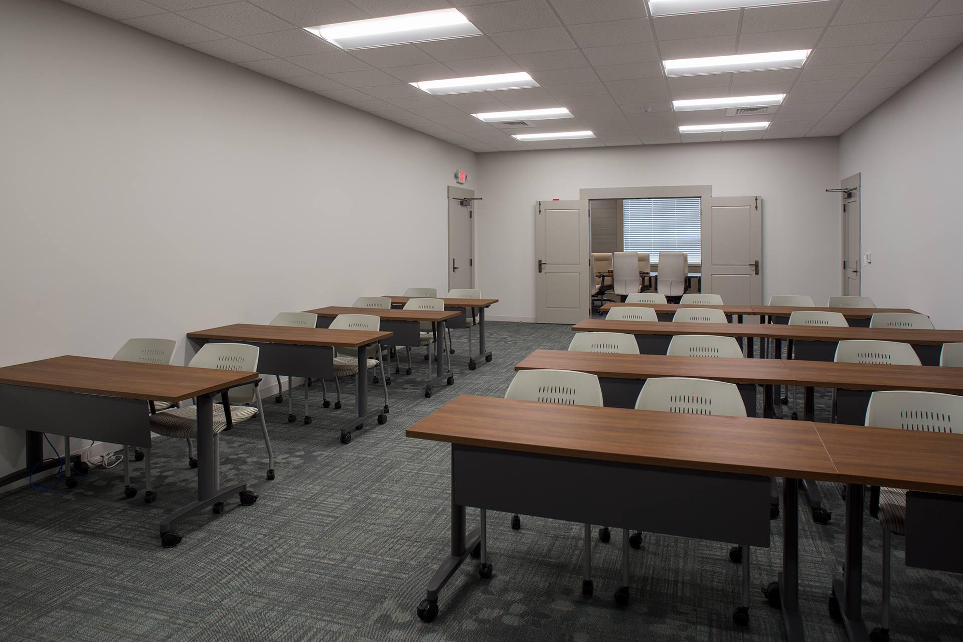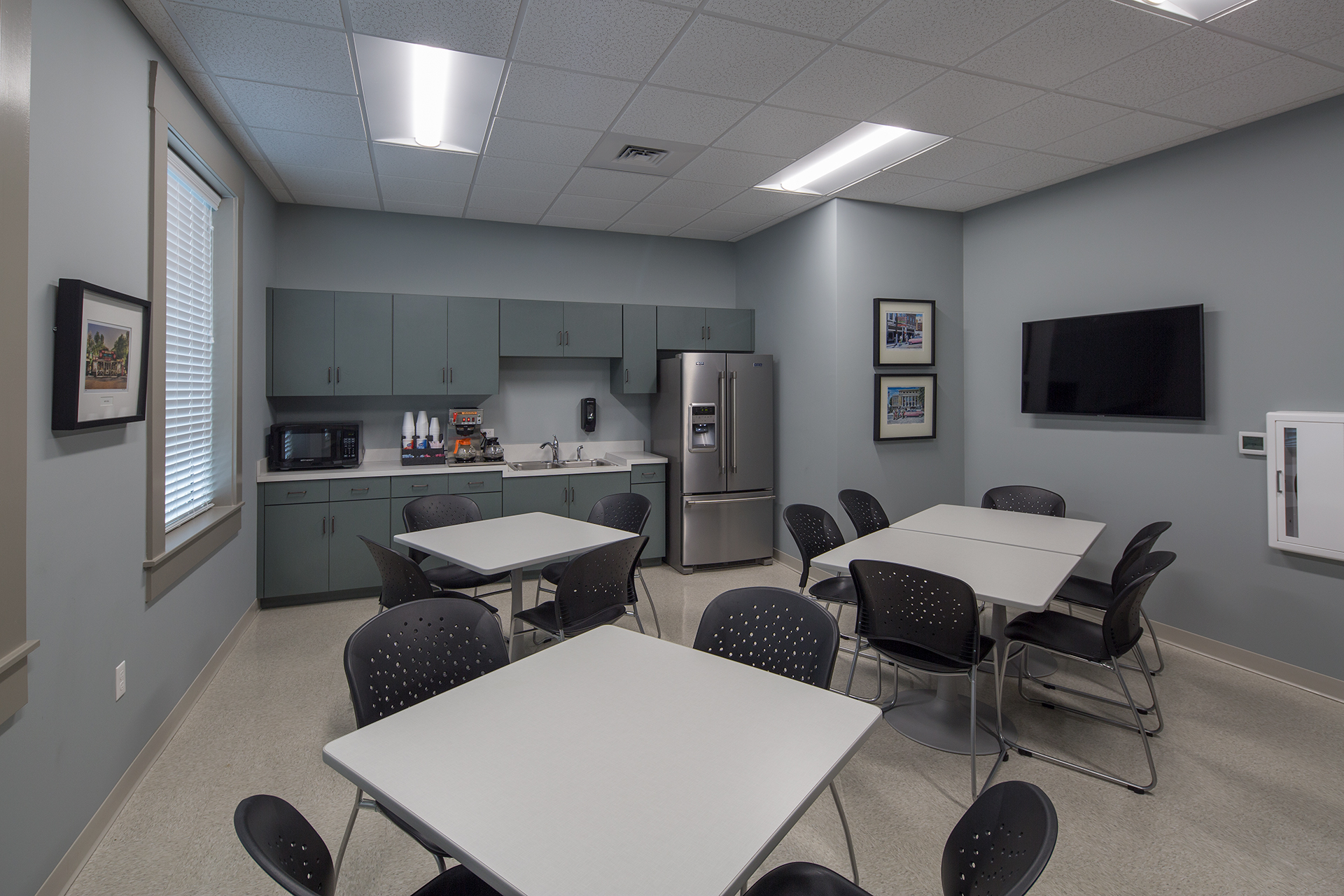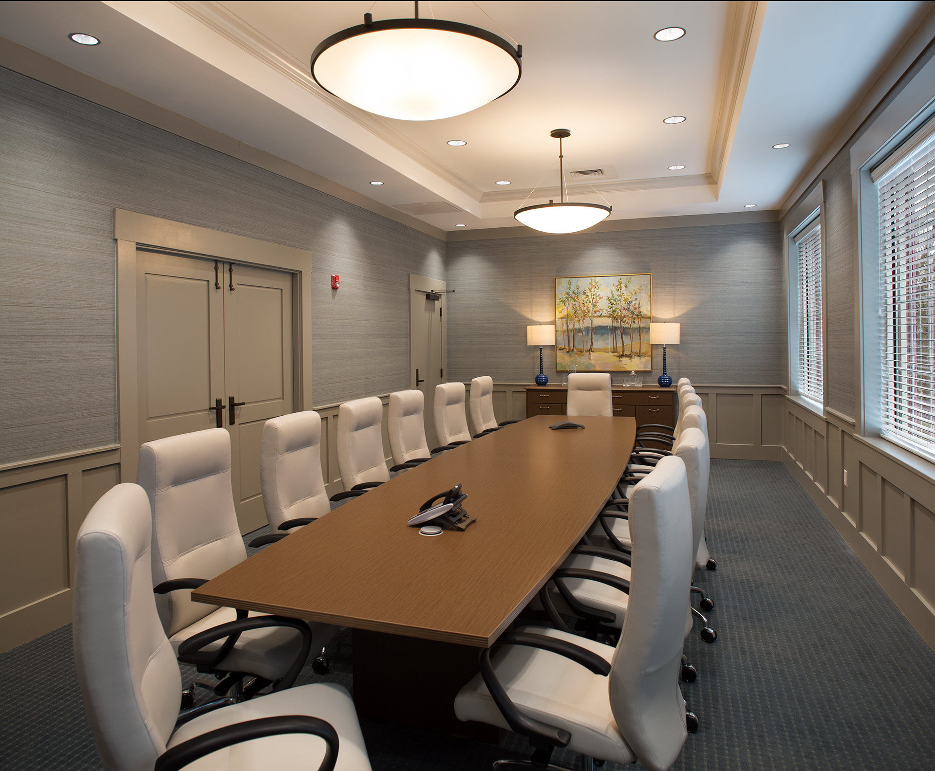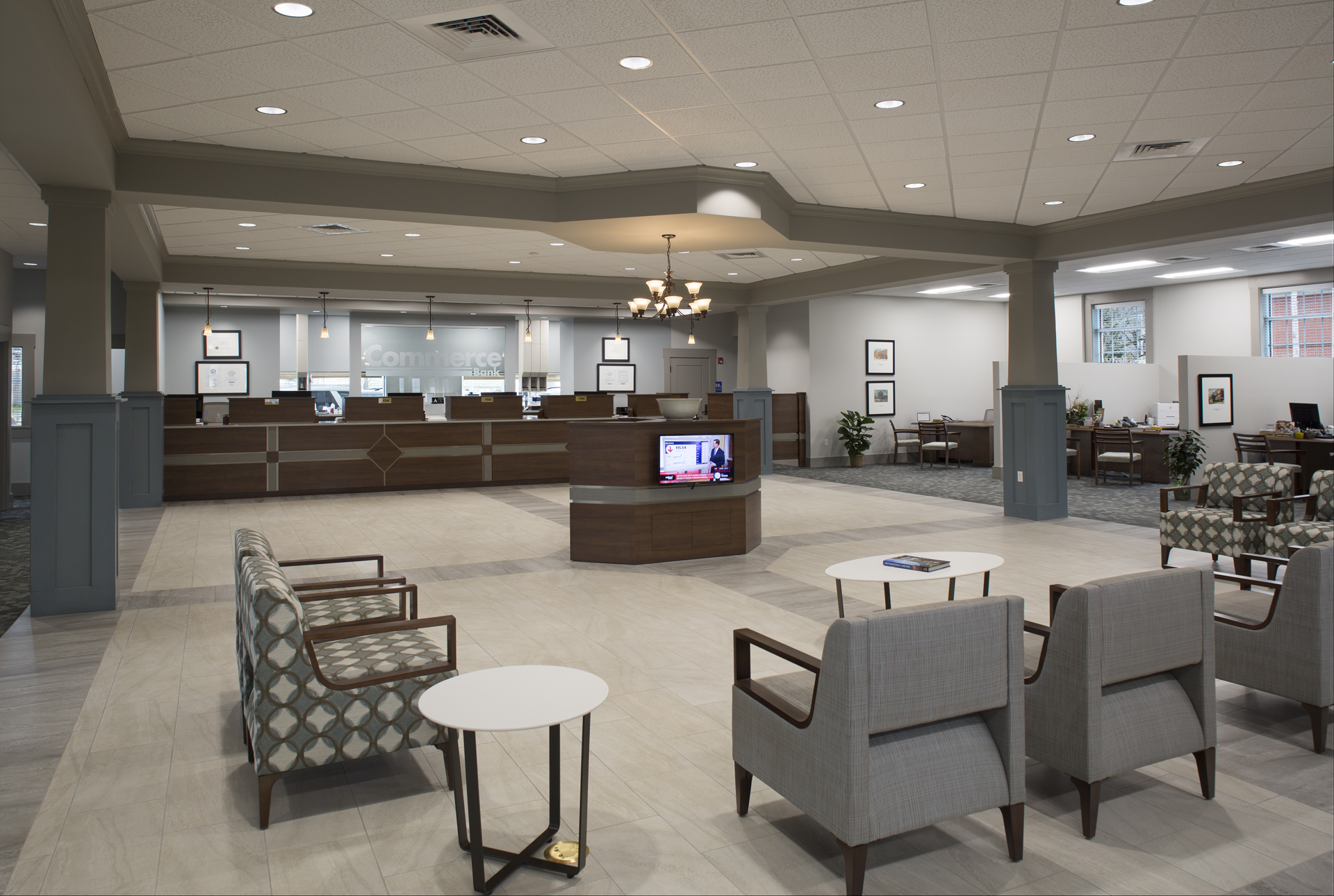 The large interior space is more modern in style than the classic exterior. The lobby features an etched glass logo on the wall behind the teller line and a large waiting area in cool, muted tones along with an area for coffee service. The second floor serves administrative and back-office functions, including executive offices, meeting and training rooms, along with operations, IT, and compliance rooms.