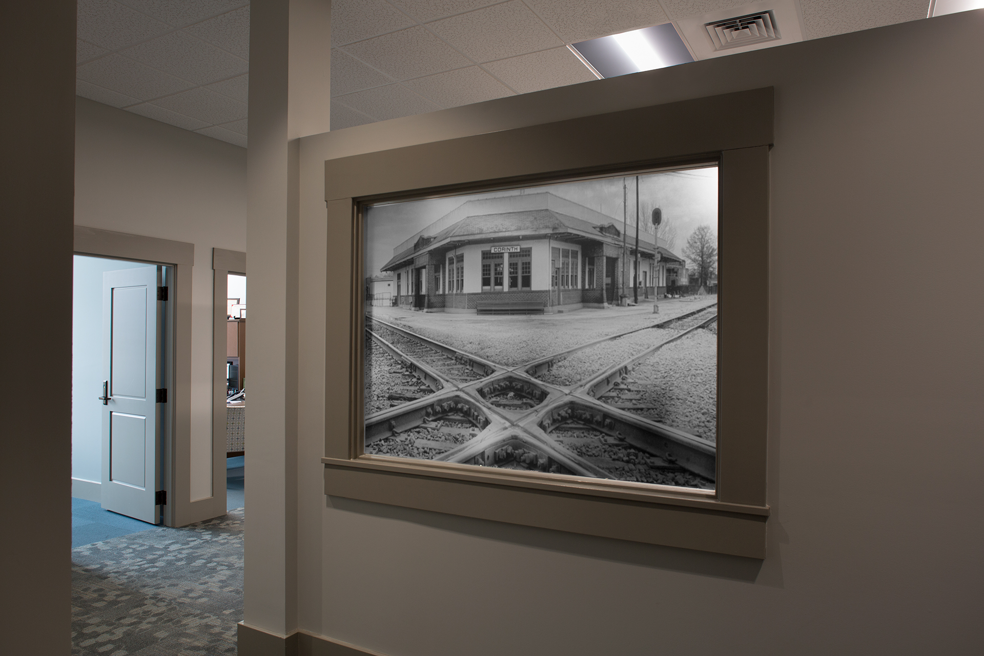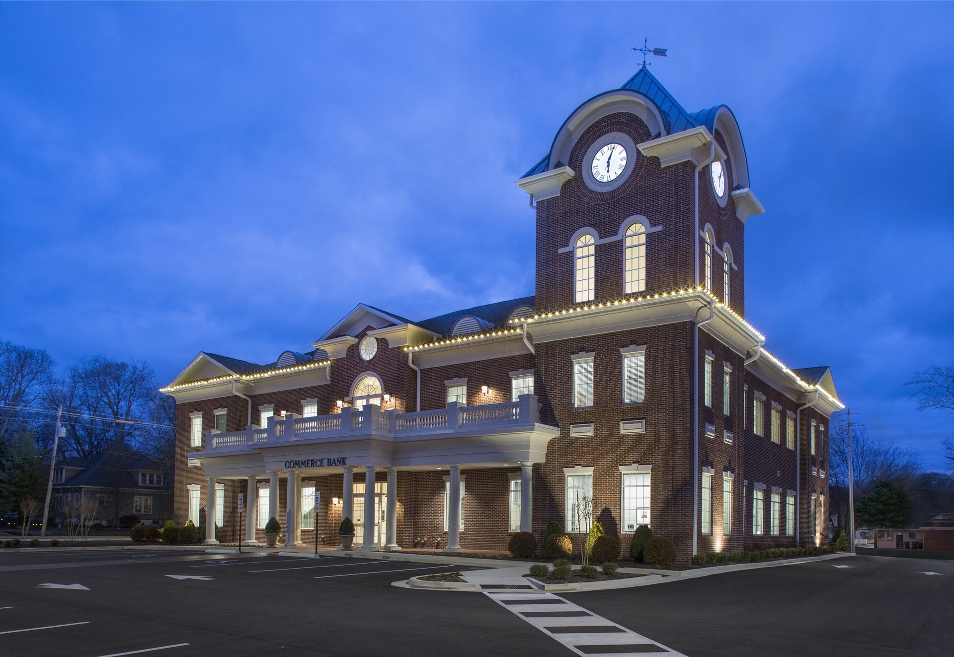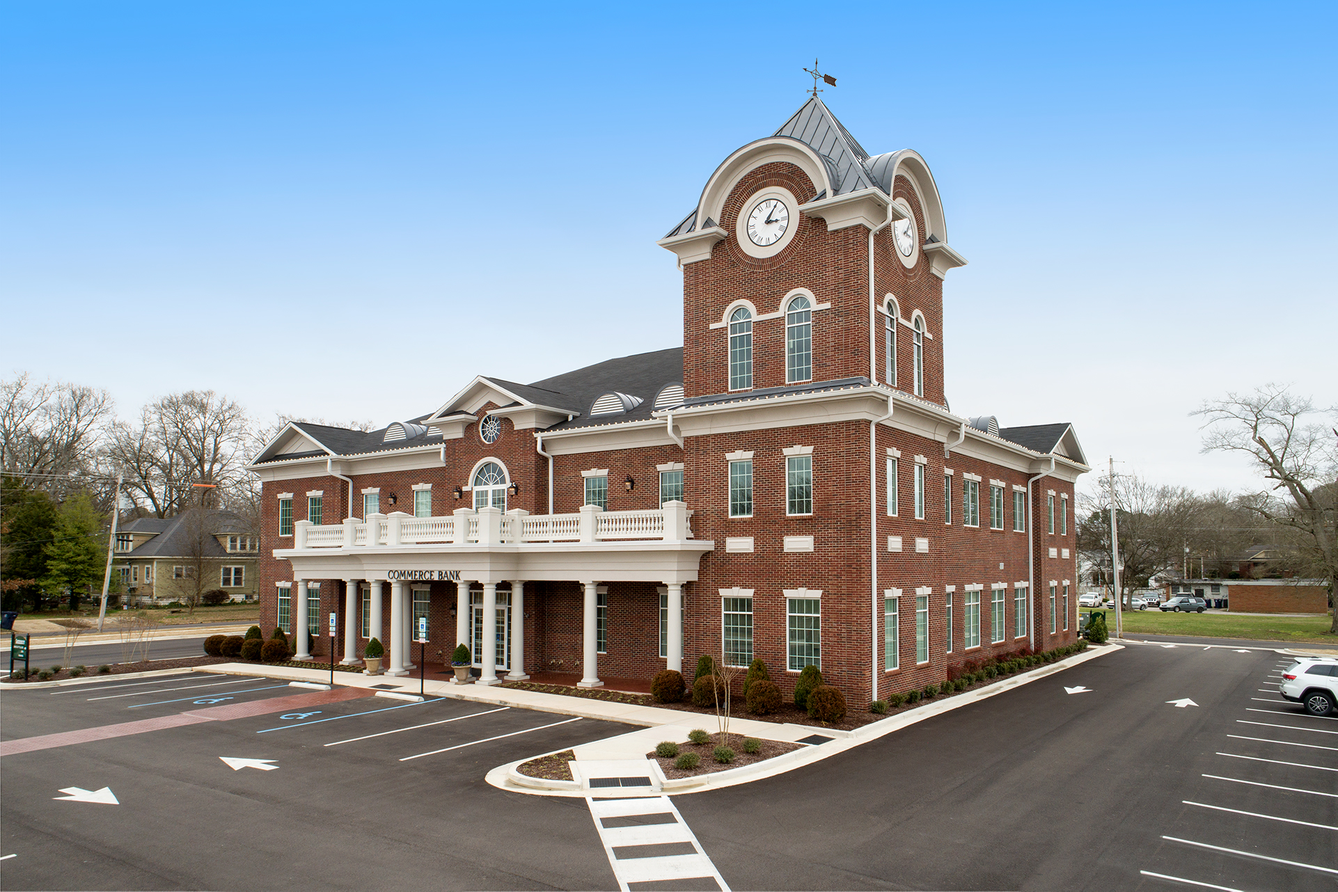Commerce Bank’s new main office in Corinth, Mississippi is located on the city block bordered by Taylor, Bunch, Webster, and Childs Streets. The bank’s new 17,215 square foot, two-story main office features an iconic clocktower and a balcony facing Taylor Street.