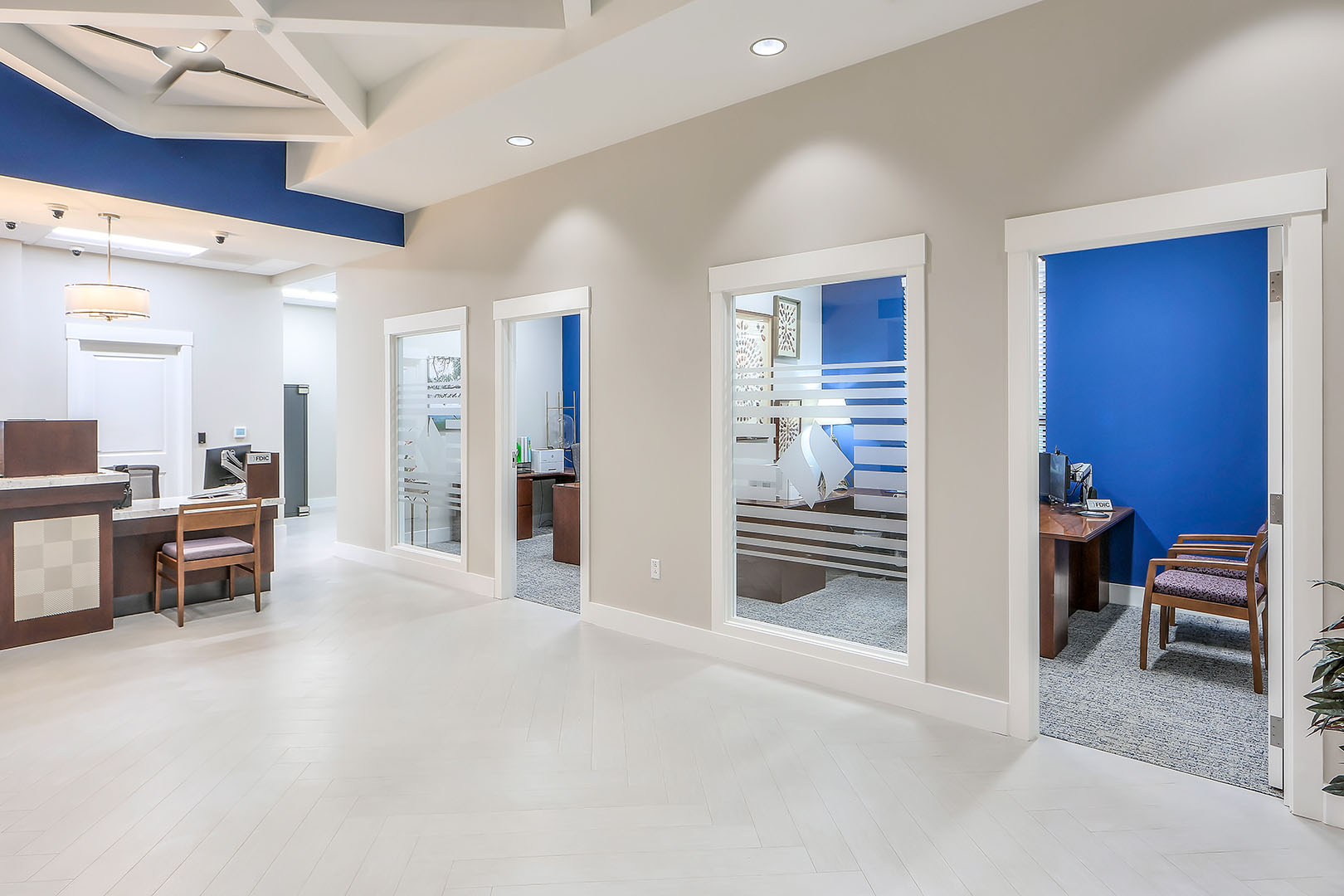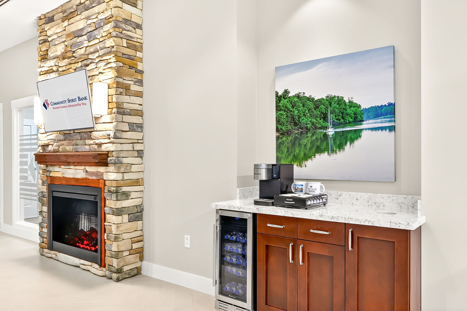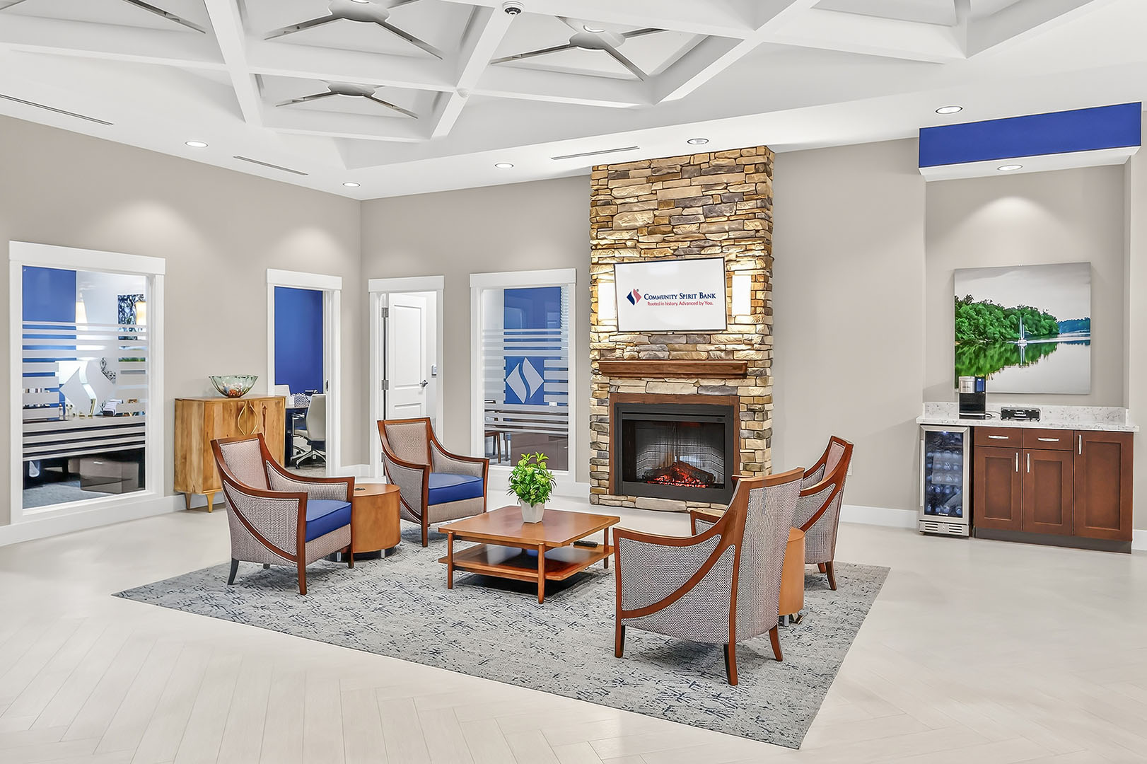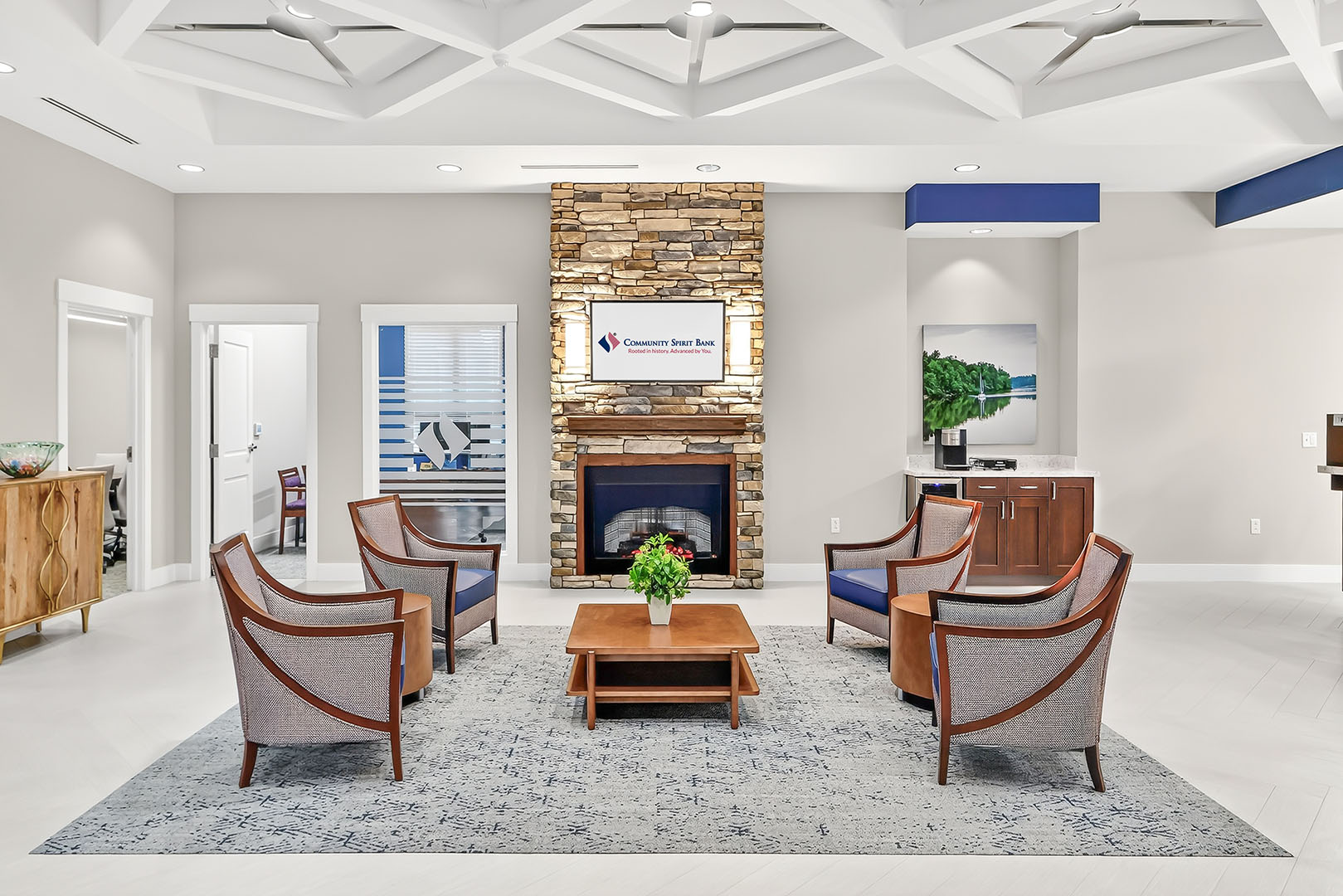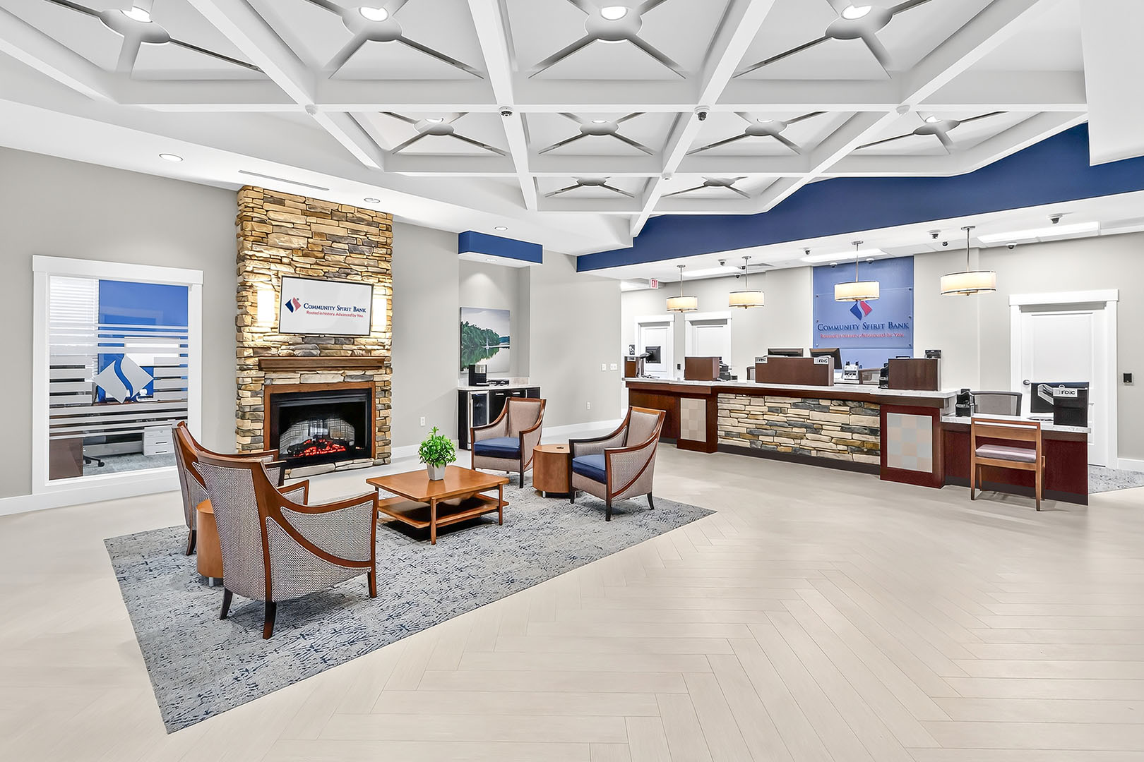 Spanning over 3,000 square feet, the new facility offers a sleek, efficient design that enhances convenience, ideally located in the heart of the Fulton community. The central lobby features a four-person open teller line, immediately greeting customers, while the waiting area, complete with a fireplace, provides a cozy and inviting atmosphere. Additional interior features include a workroom behind the teller line, four private offices, an employee lounge, and a conference room—all thoughtfully designed to support staff and ensure a productive work environment.