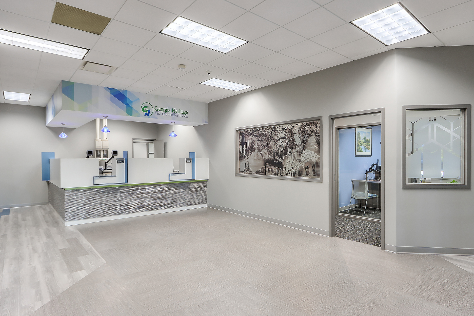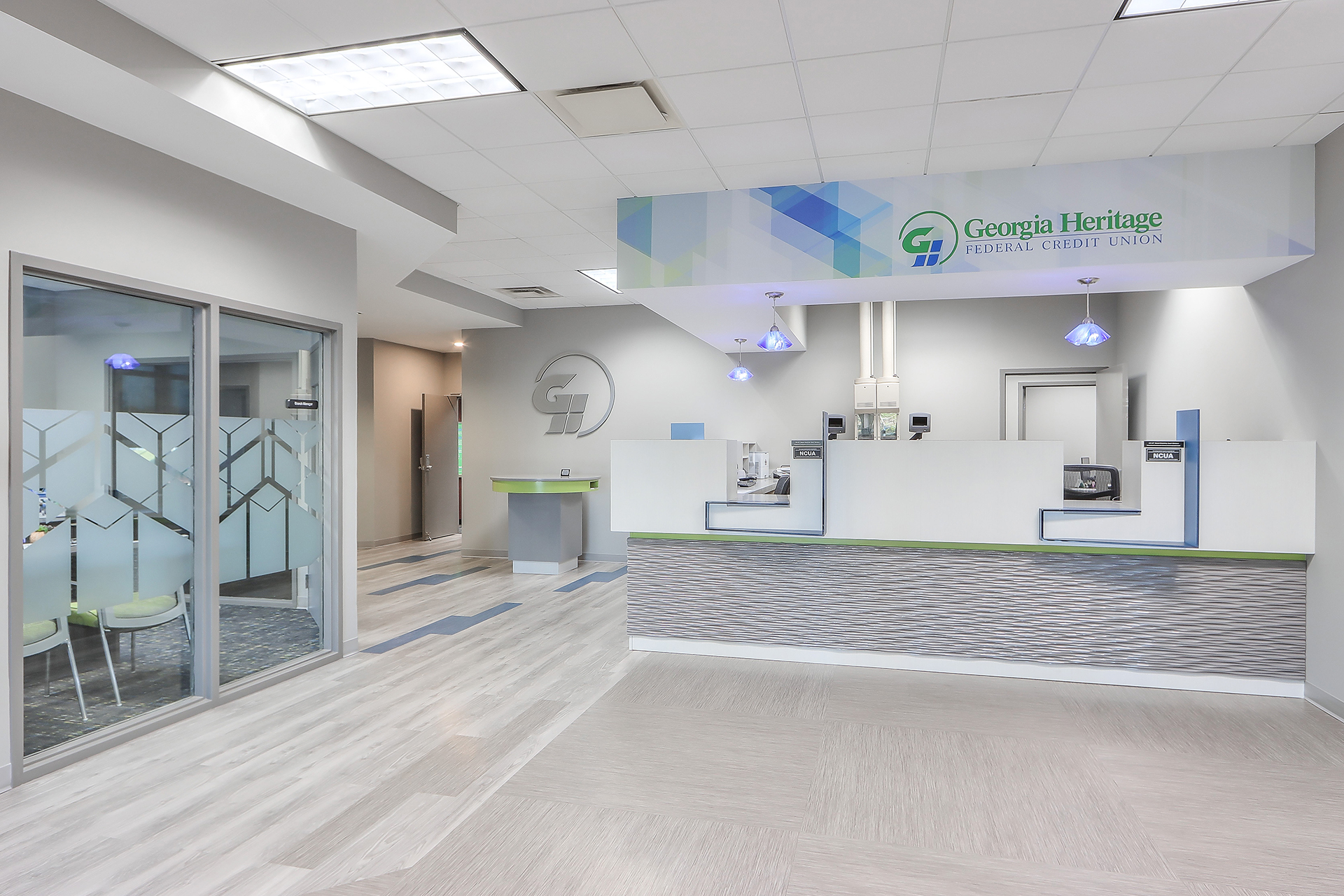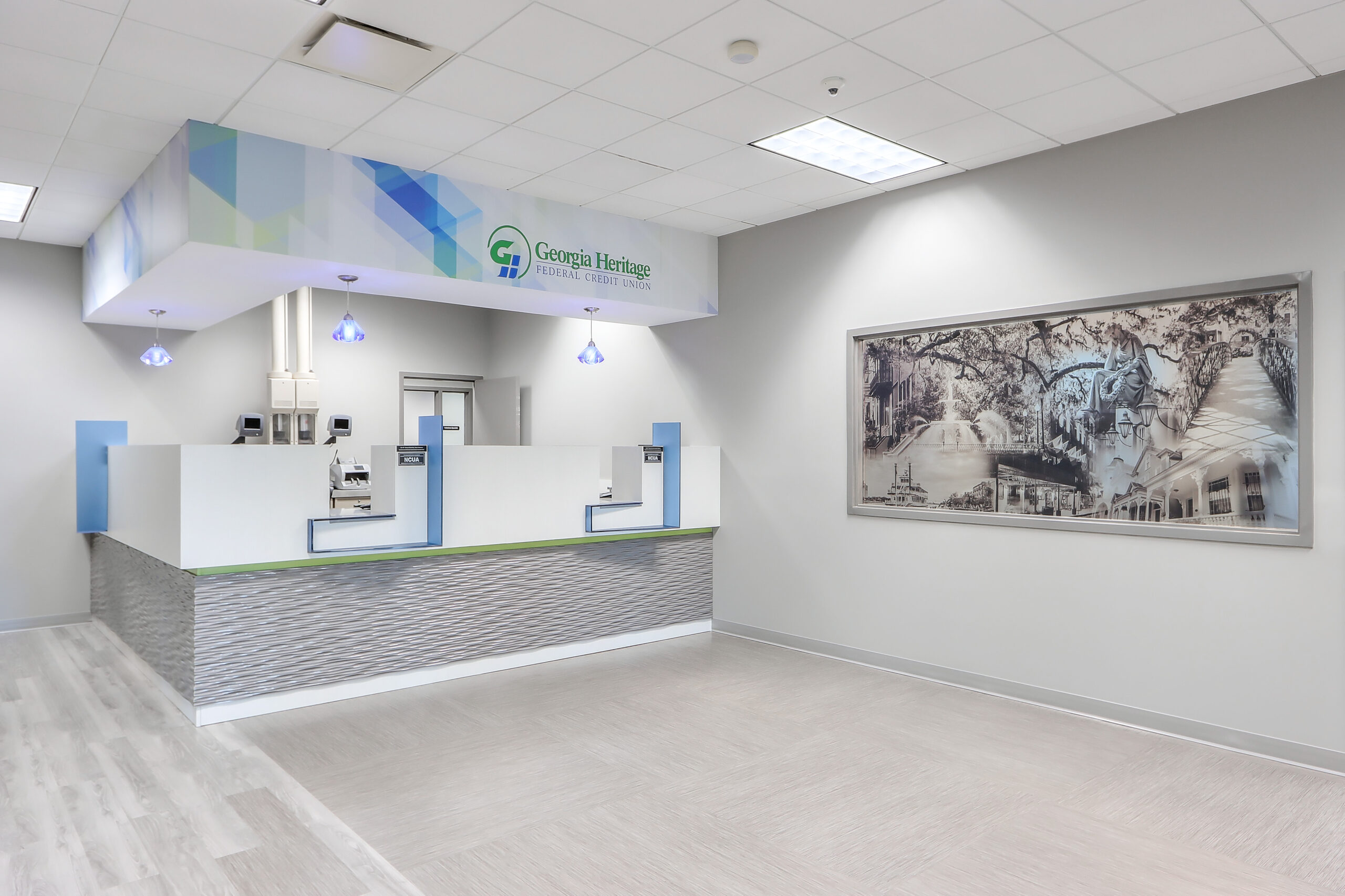 Georgia Heritage Federal Credit Union completed renovations on its branch office located in Pooler, Georgia to infuse new life into the space and create an energetic and efficient banking space! Renovations included new graphic wall coverings, a new reception desks, and updated countertops throughout. Other improvements not only elevate the branch office aesthetically, but also help with functionality and member services.