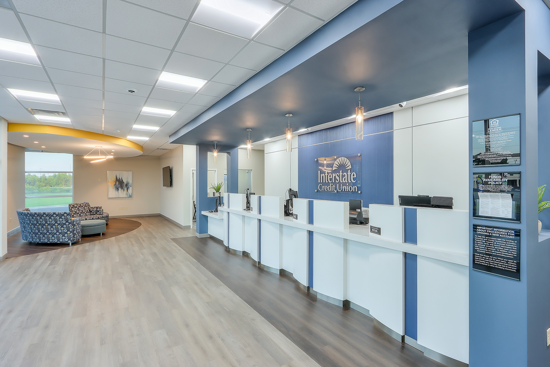 Interstate’s renovated branch office showcases a striking exterior design completely transforming the previous AT&T building. The addition of eye-catching blue walls and accents of Interstate gold create a visually appealing façade that effortlessly aligns with the Credit Union’s branding.