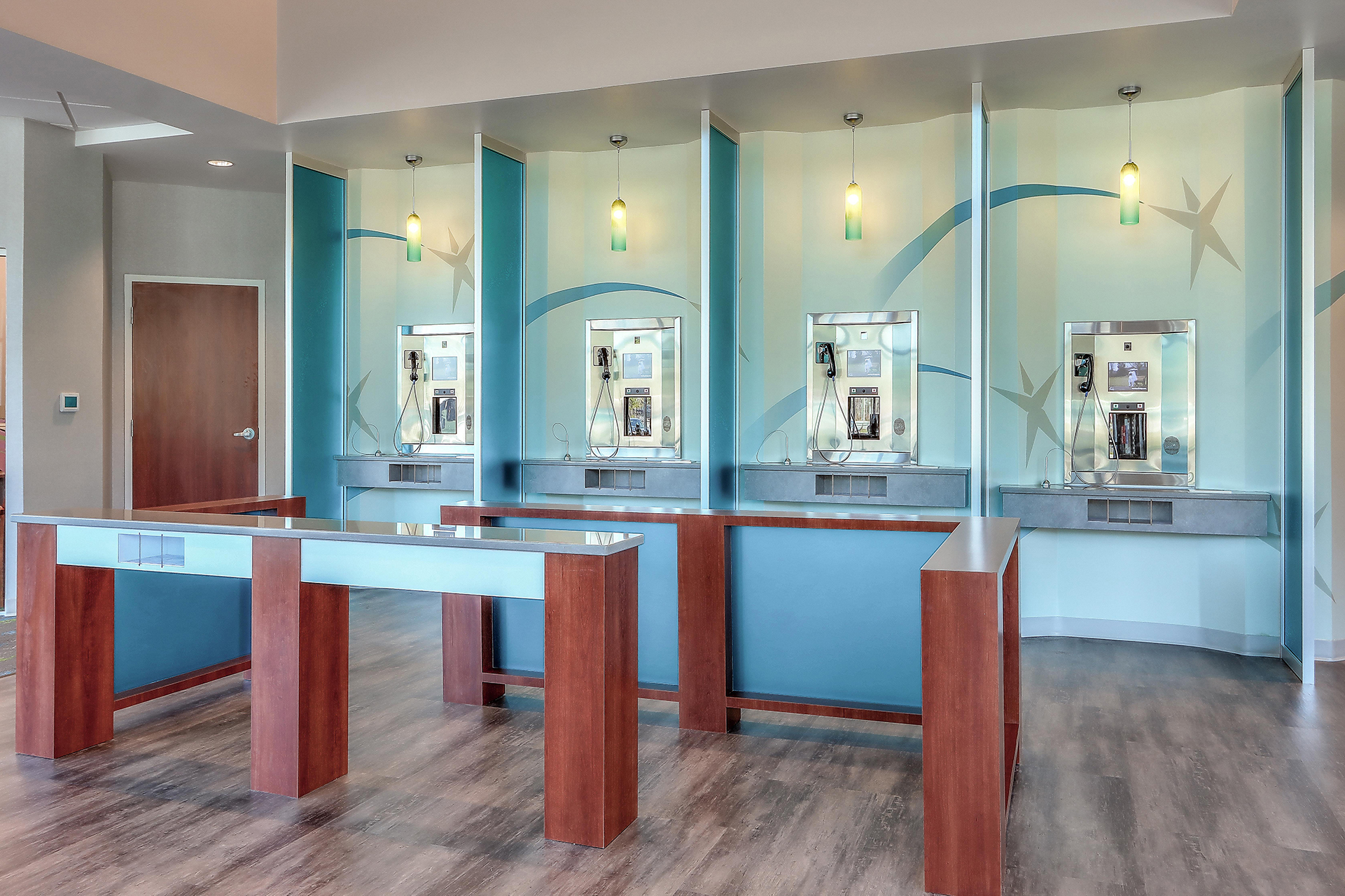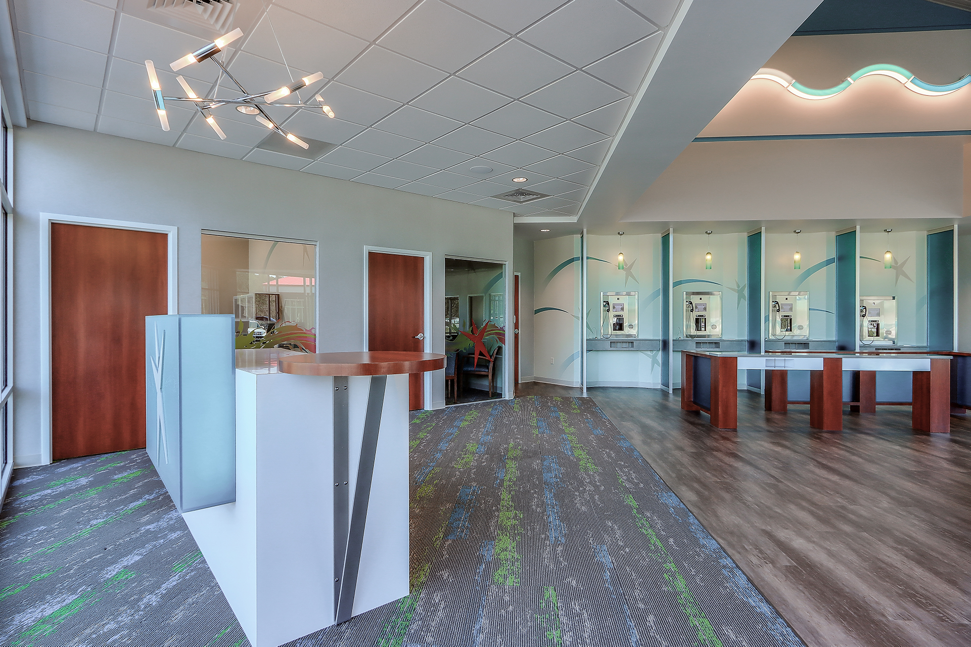 The new 4,100 square foot branch features drive-thru service lanes and a 24-hour drive-up ATM that will also take deposits. The lobby is bright and inviting, with a member greeting station to direct members to the best advisor to assist them. Four offices are located on each side of the lobby to serve members in private. In place of a traditional teller-line, Remote Teller Units are positioned behind the greeting station, and branded graphics and colors are applied around the RTUs, creating a high-tech feature wall.