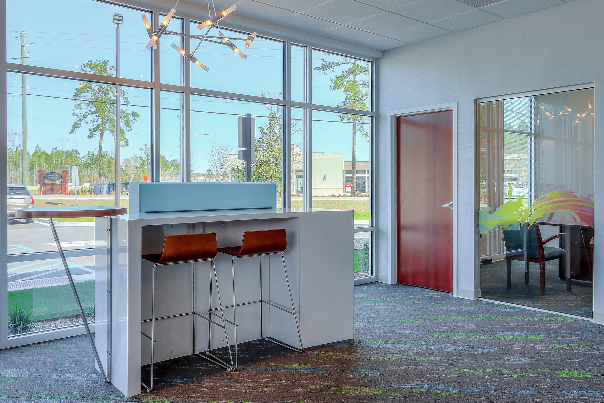 MembersFirst Credit Union partnered with design-build firm Eclipse Brand Builders for this project after having worked with the firm to successfully complete the design and construction of another branch office in Pooler, Georgia in early 2021. The new 4,100 square foot branch features drive-thru service lanes and a 24-hour drive-up ATM that will also take deposits. The lobby is bright and inviting, with a member greeting station to direct members to the best advisor to assist them. Four offices are located on each side of the lobby to serve members in private. In place of a traditional teller-line, Remote Teller Units are positioned behind the greeting station, and branded graphics and colors are applied around the RTUs, creating a high-tech feature wall.