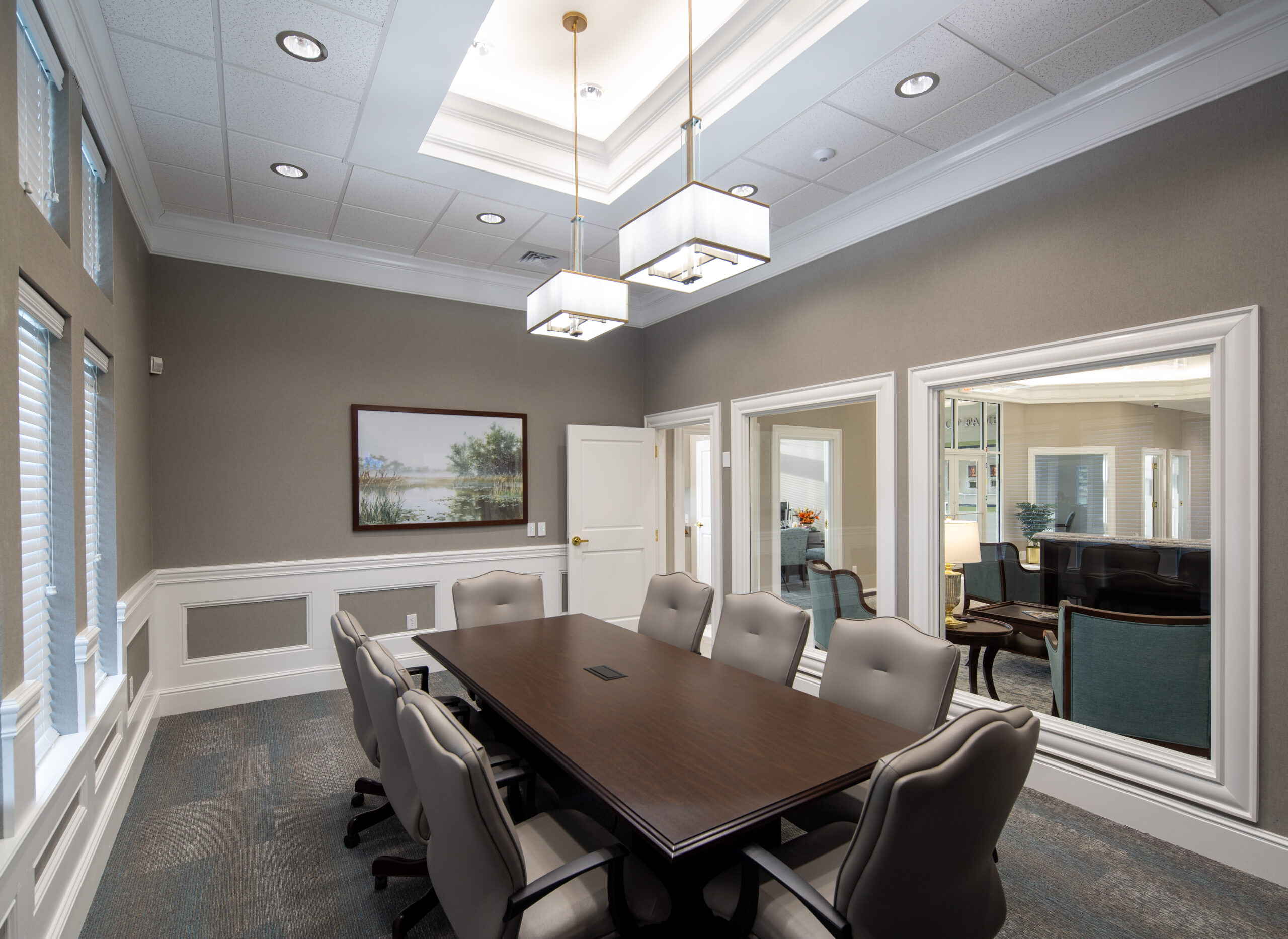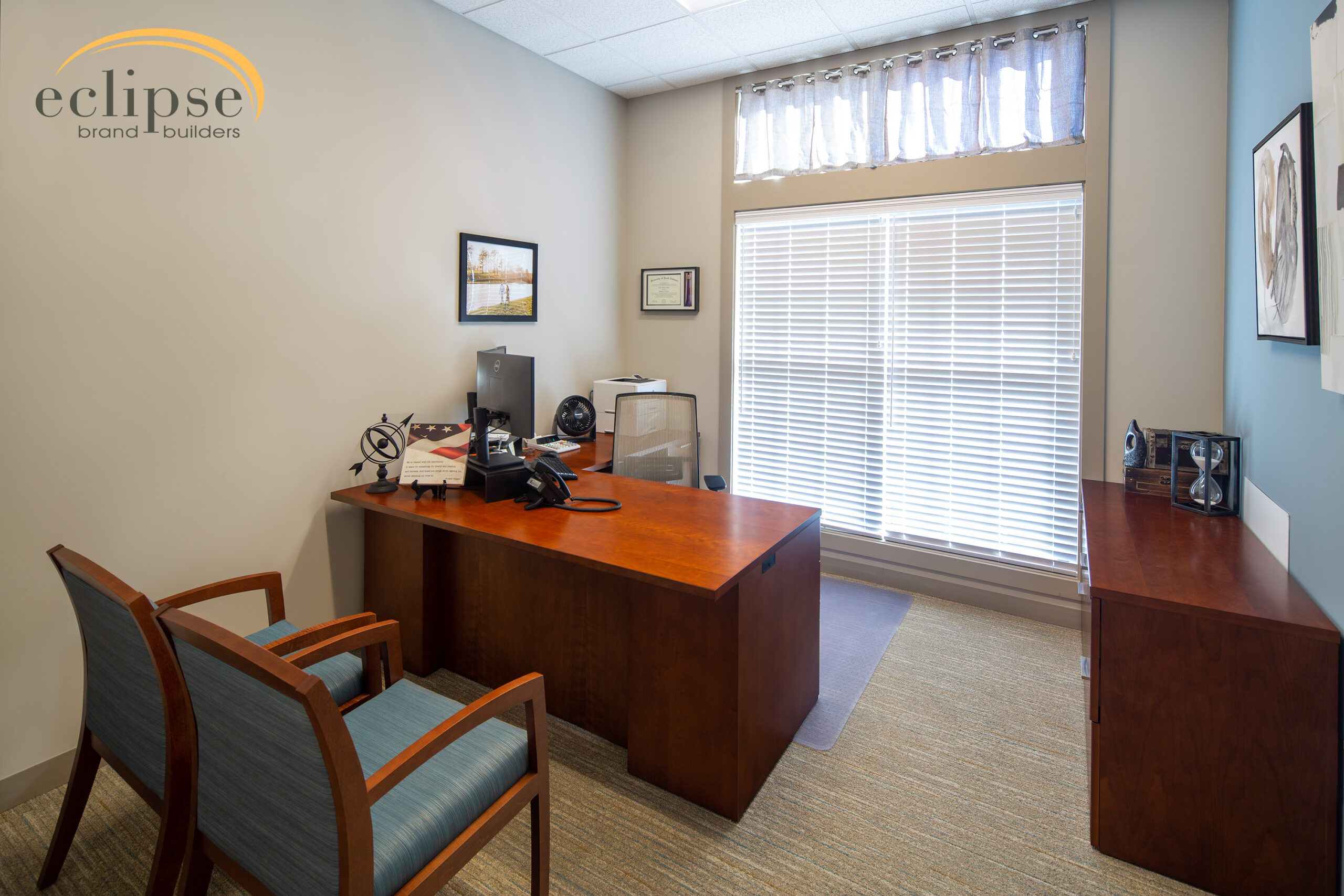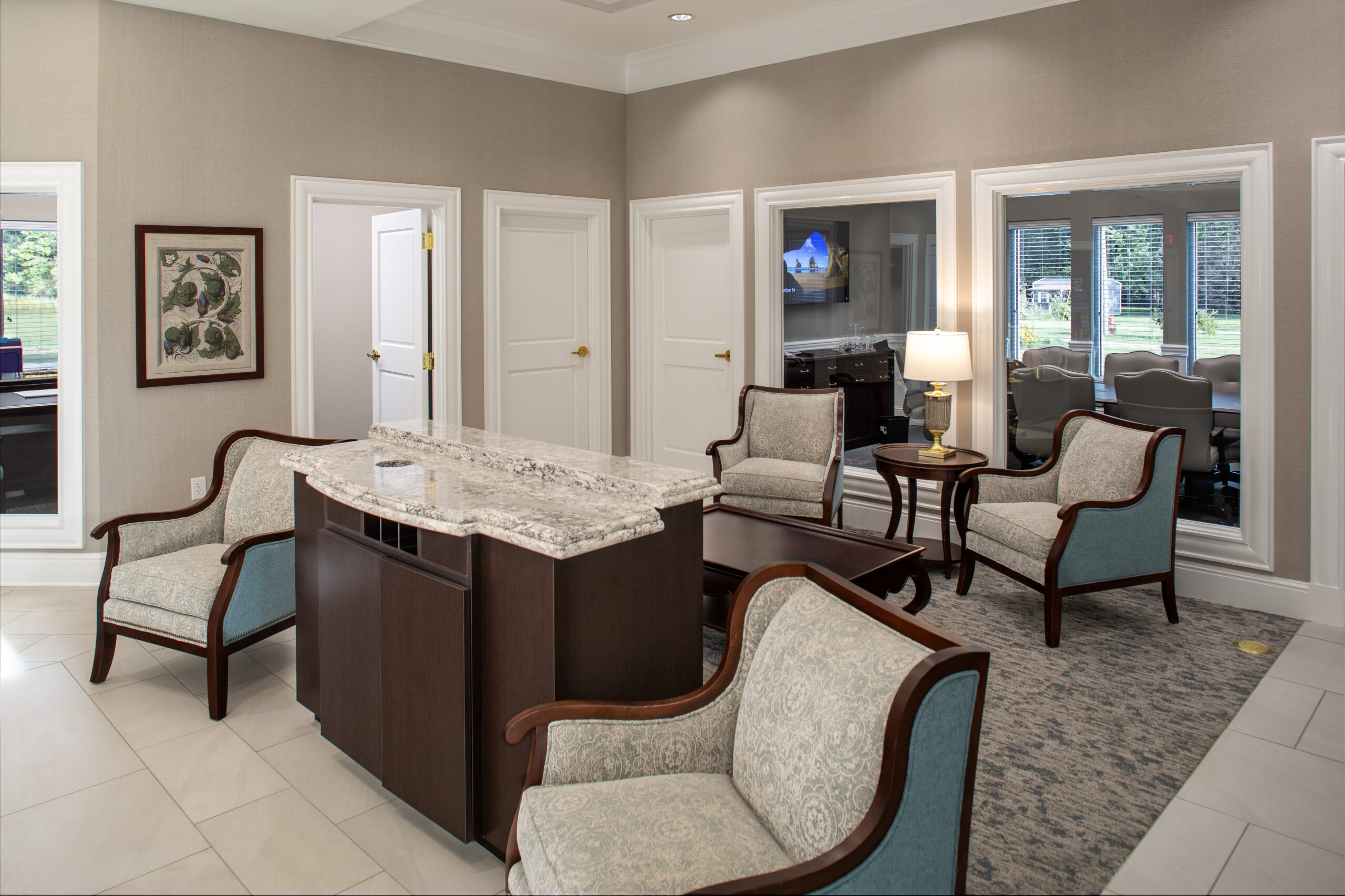 The branch office’s interior showcases a comfortable central lobby with a two-person teller pod as well as a work counter and a drive-up teller located behind the main teller pod. In addition, the new branch office includes five offices, a conference room, an employee lounge, and two accessible restrooms.