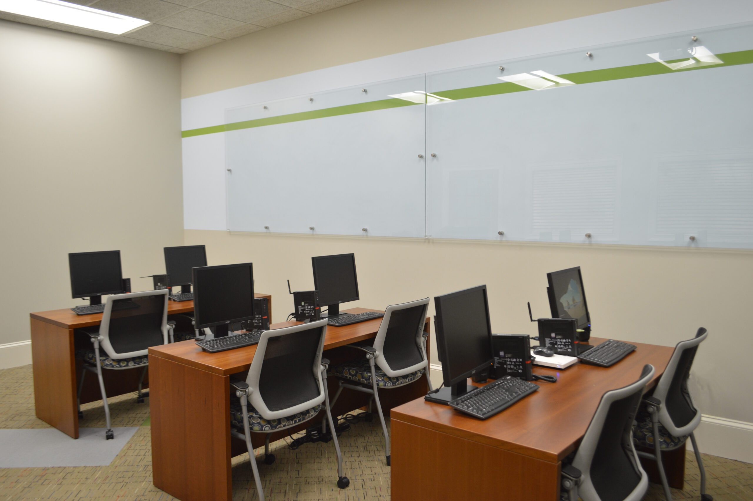 The renovated facility combines an open floor plan with carefully configured workstations and floating acoustic panels to maximize noise reduction and create branded backdrops for the ITM call center’s video communications.